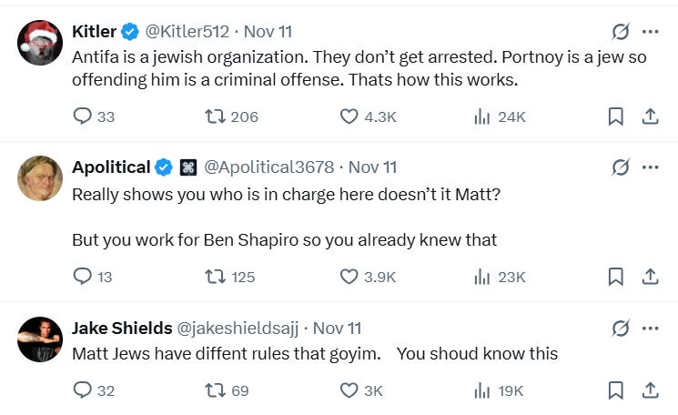 With this post Walsh was appealing to the Fuentes crowd by suggesting that Jews like Portnoy get special treatment. Expect a lot of this in the year to come; grift-hungry “mainstream” rightists who aren’t ready or willing to make the “JQ jump,” but who still want in on the Nazi aktion by tweeting “suggestive” posts like this one.