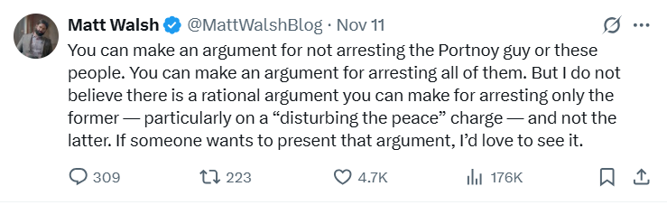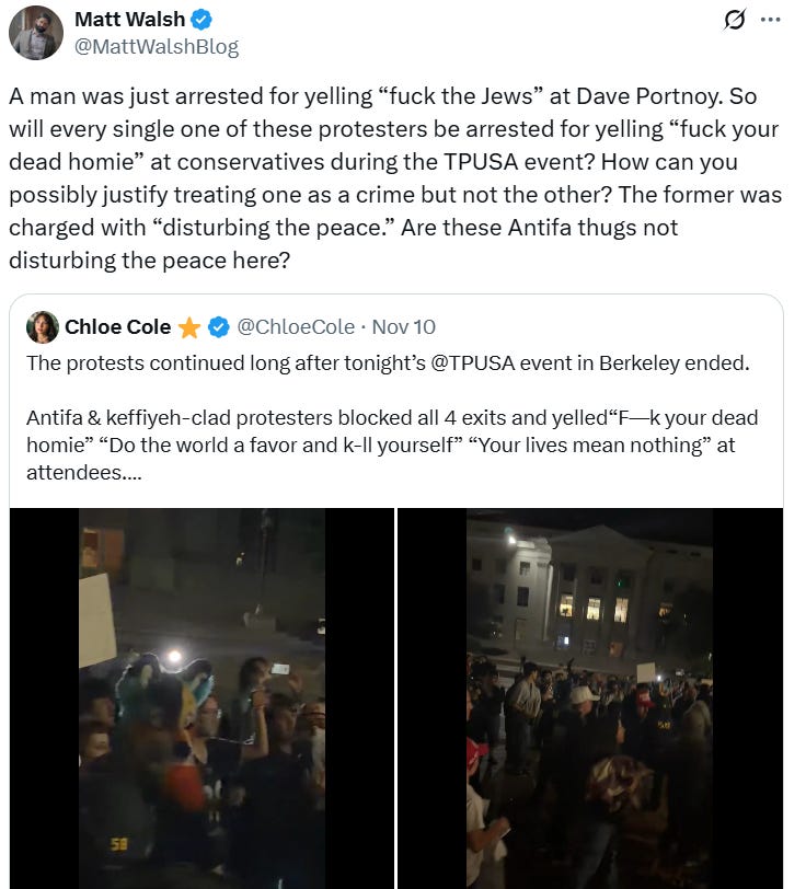 Matt Walsh, falsely believing that nobody at the Berkely event was arrested, tweeted his outrage: