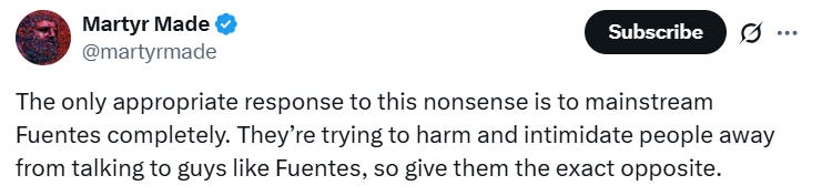 Walsh’s point is essentially, “Canceling Tucker, Owens, or Fuentes for their views on Jews is as bad as canceling me for my views on trannies. We must support with equal vigor anyone ‘on the right’ who is targeted for cancelation, as it’s all part of the same oppressive game of silencing us.”