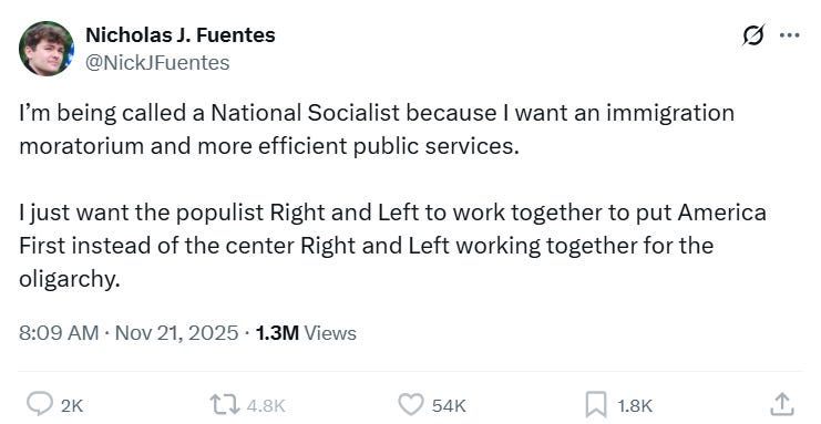“Ooooh, I love that Nick Fuentes! I don’t necessarily agree with everything he says - I’d rather deport the Jews than kill them - but his balls-out YOUTHFUL NAZI ENERGY is what will save us all!”