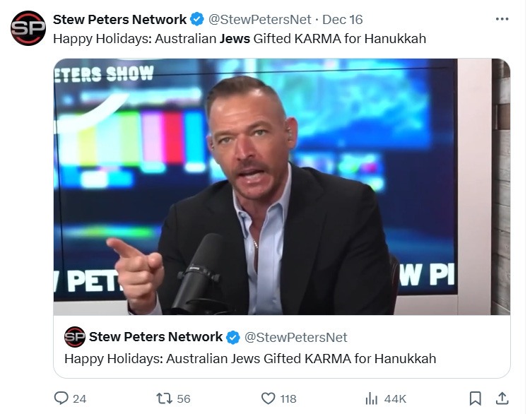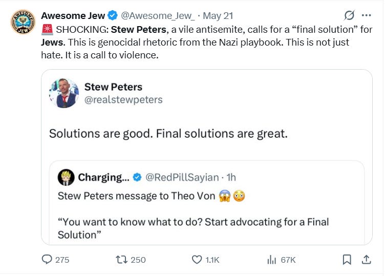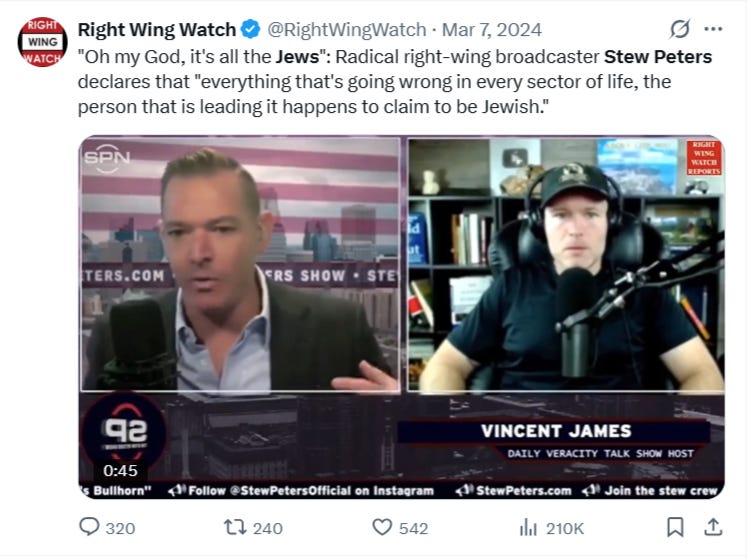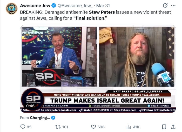 For years at Takimag I railed against Stew Peters. Peters is a guy who legit wants to murder American Jews. He’s repeatedly called for a “final solution” to the Jewish question in the U.S., and he’s brazenly stated that this means engaging in violent, criminal action against ordinary Jews.