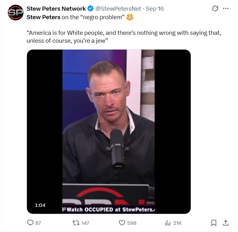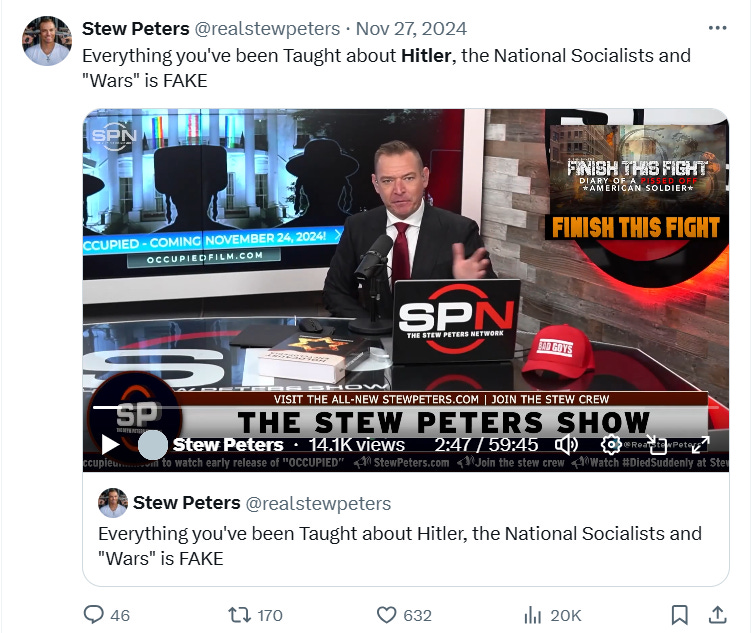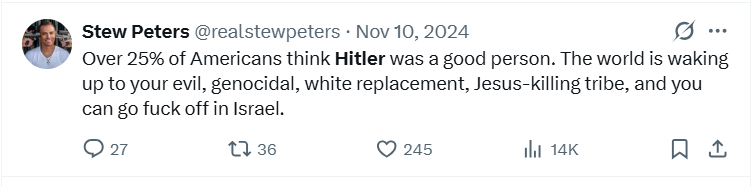 On his February 10th, 2024, show, Peters hosted a Hitler admirer named Arthur Kwon Lee, who referred to Jews as “sewer dwellers.” Affirming that view, Peters stated, “The problem isn’t Zionism, the problem is Jews,” adding, “Jews are cowards. They fake being Jews,” again reiterating, “What do you think the problem is with America? The Jews.”