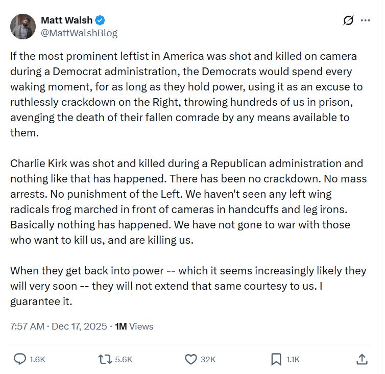 Back to reality: you imbeciles are NOT being killed. Nobody is killing you. Walsh is not “being killed.” Charlie Kirk was killed, but it’s Walsh who supported platforming the loons who claim it wasn’t a “leftist” who killed him (as Walsh also urged platforming the Groypers who inspired the mass shootings in which nonwhites were not “theoretically” killed, but kill-killed).