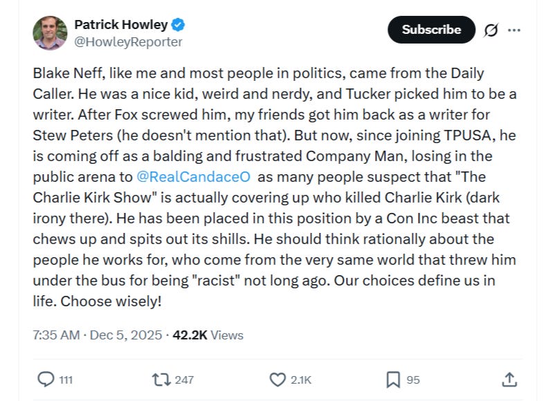 Yes, Blake briefly worked for Nazi Stew Peters. And Howley decided to destroy Blake by revealing it. Because Howley’s a monster, a worthless specimen the world would be better off without. He was so fucking angry that Blake wasn’t on board with Candace’s “Jews killed Kirk, TPUSA killed Kirk, Erika killed Kirk” bullshit, he decided to try to get Blake re-canceled, out of spite.